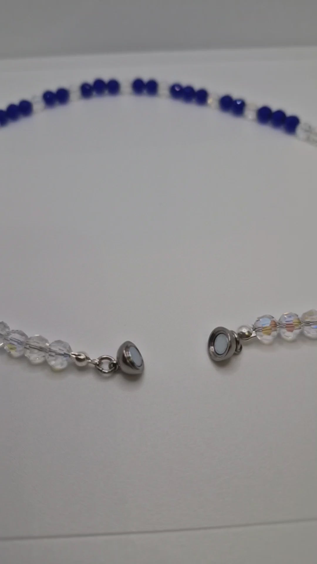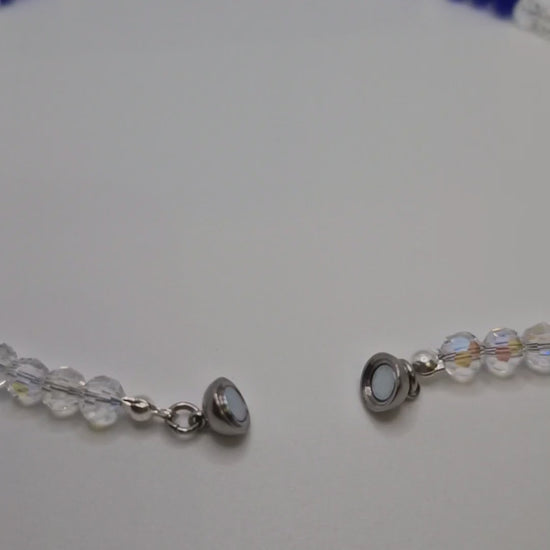 This shimmering necklace blends deep dark-blue Czech crystal beads with clear AB-coated Czech crystals, each cut in a 6mm faceted round for maximum sparkle. The combination offers a sleek, versatile look perfect for both everyday wear and special occasions. The stainless steel magnetic clasp provides a strong, convenient closure while maintaining a polished finish.