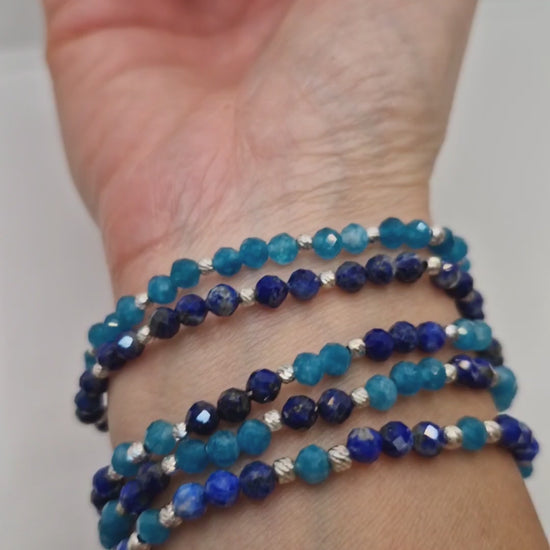 Blue Turquoise & Lapis Lazuli Stretch Bracelet for Communication and Wisdom – 4mm Faceted Gemstones with Sterling Silver