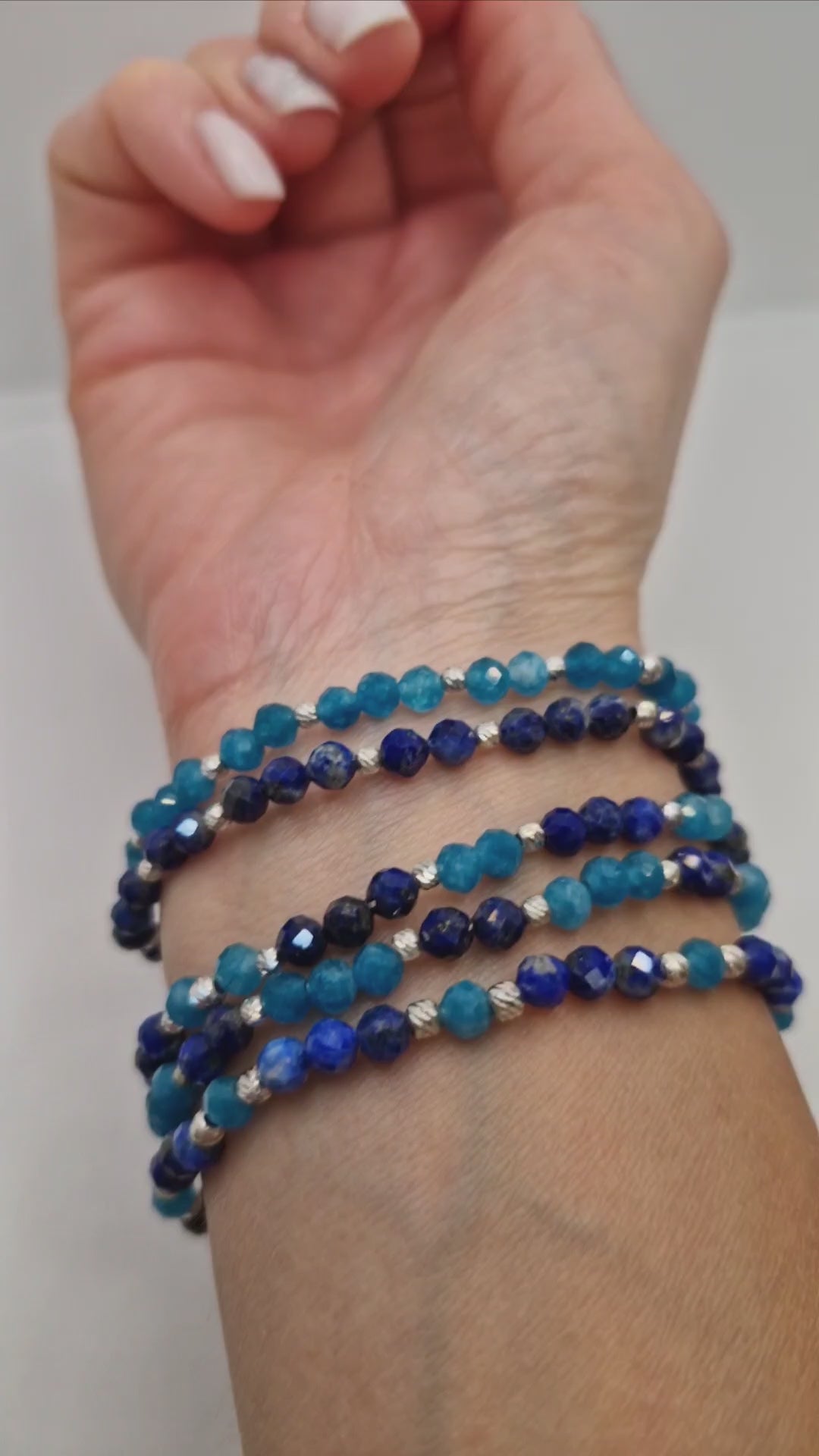 Turquoise & Lapis Lazuli Collection– A refined selection of handcrafted stretch bracelets designed for balance, protection, and inner peace. Each bracelet is made with authentic natural gemstones and finished witg sterling silver corrugated beads for timeless elegance.