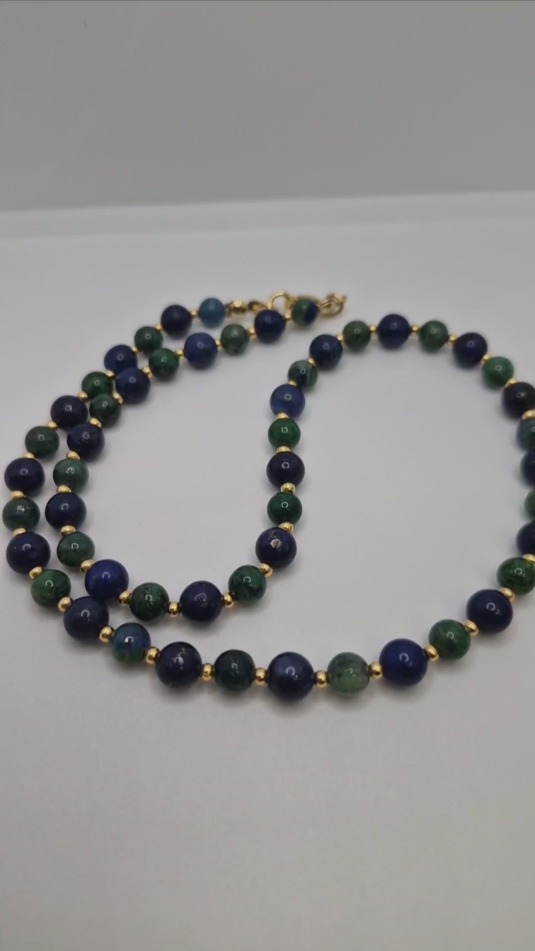 This handcrafted Lapis Lazuli & Chrysocolla Necklace features 6mm natural gemstones, elegantly paired with 2.5mm gold-plated accent beads and a polished gold-plated clasp. The result is a refined, ocean-inspired piece that embodies calm energy, emotional balance, and timeless beauty.