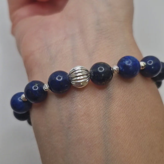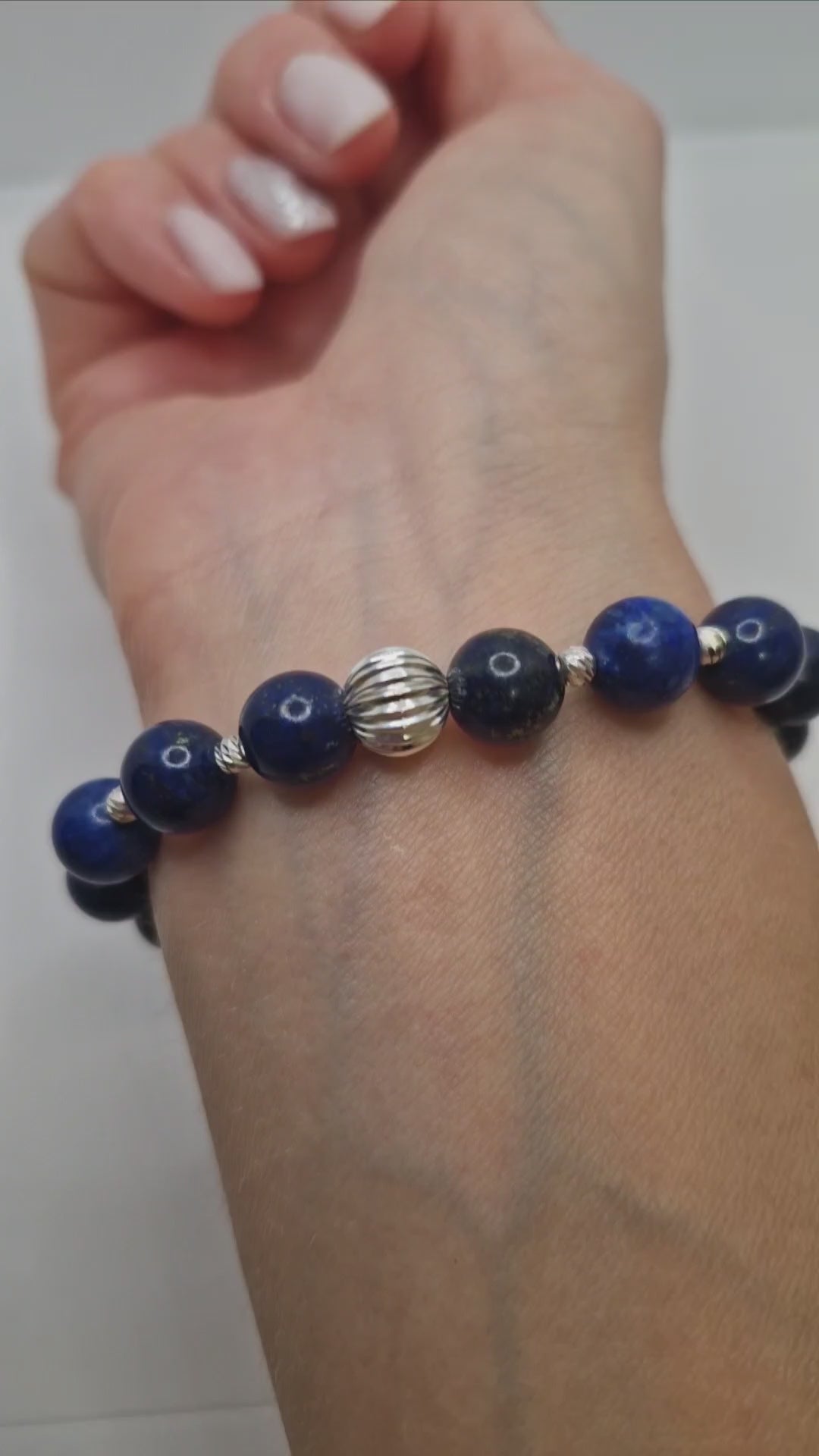 This handcrafted stretch bracelet features 8mm natural Grade A Lapis Lazuli gemstones paired with sterling silver corrugated beads (2.5mm) and a single 8mm silver focal bead, adding a refined touch and lasting shine.